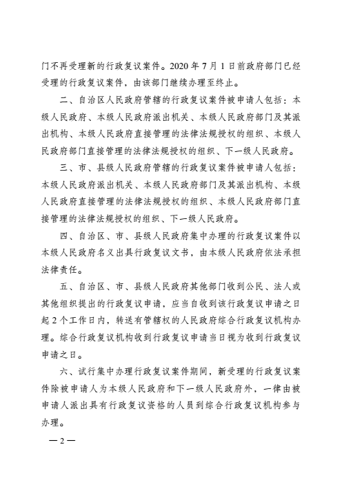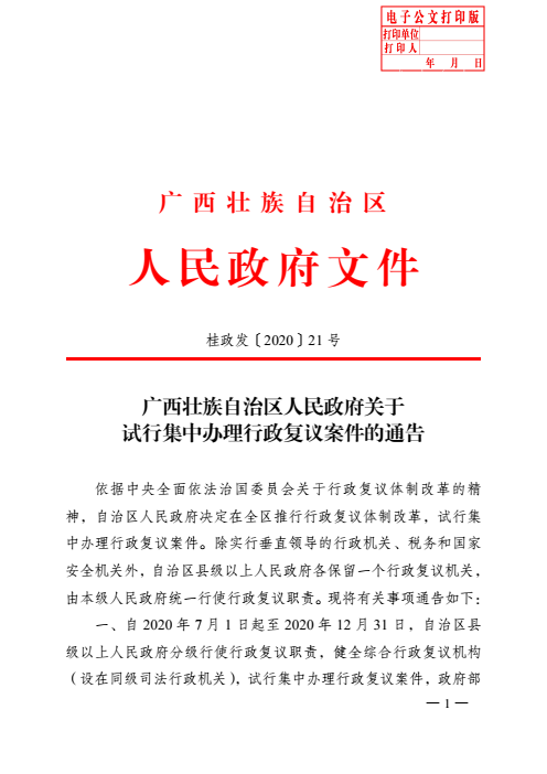 广西壮族自治区人民政府关于试行集中办理行政复议案件的通告