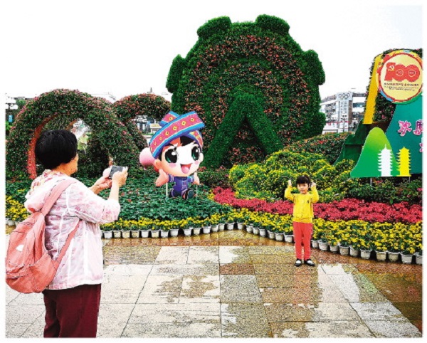 市民在中心广场花坛前拍照留影。通讯员李腾钊 摄