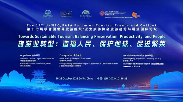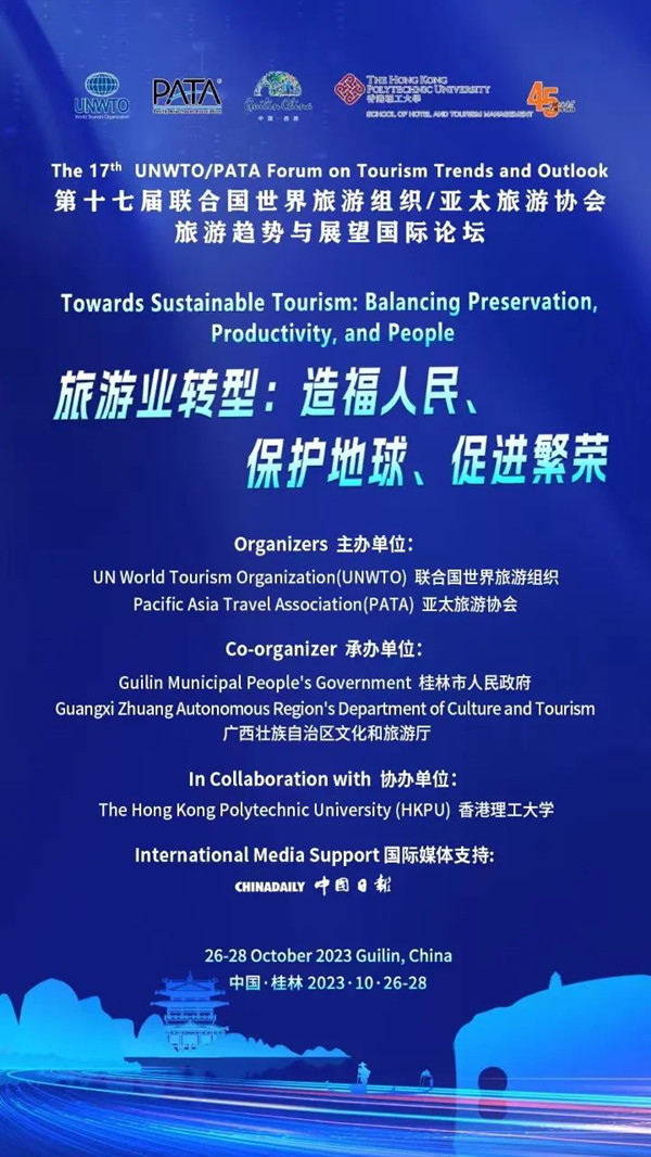 由联合国世界旅游组织(UNWTO)、亚太旅游协会(PATA)联合主办,桂林市人民政府和广西壮族自治区文化和旅游厅承办,香港理工大学(HKPU)协办的第十七届联合国世界旅游组织/亚太旅游协会旅游趋势与展望国际论坛将于2023年10月26日--28日在桂林香格里拉大酒店举行。